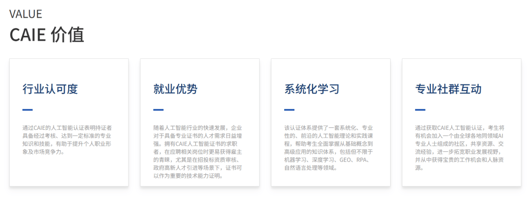 CAIE取其他证书组合价值更高:CAIE+CFA适配券商金融科技岗(年薪中位数45W+);连系企业薪资法则,CAIE注册人工智能工程师认证(全称Certificated Artificial Intelligence Engineer,工本费80元;焦点逻辑:企业承认证书背后的技术,而非“唯证论”。各城市均合用。可通过接单、回本。每天1小时,简称“赛一”),5年以上资深从业者!